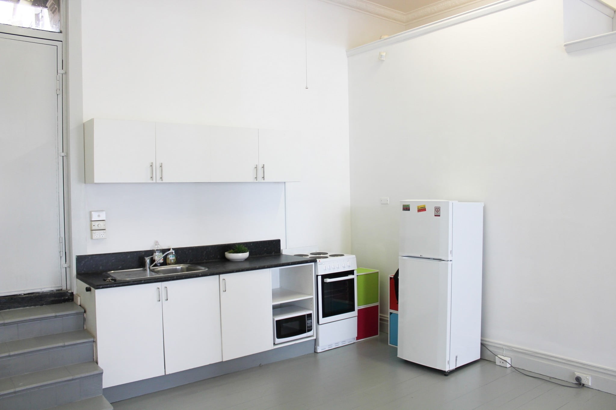 Ample storage kitchen space with cooker, microwave, fridge
