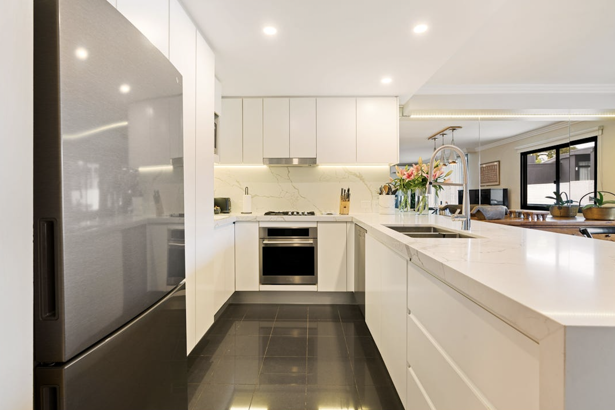 • Modern stone & stainless steel kitchen with gas cooktop.
