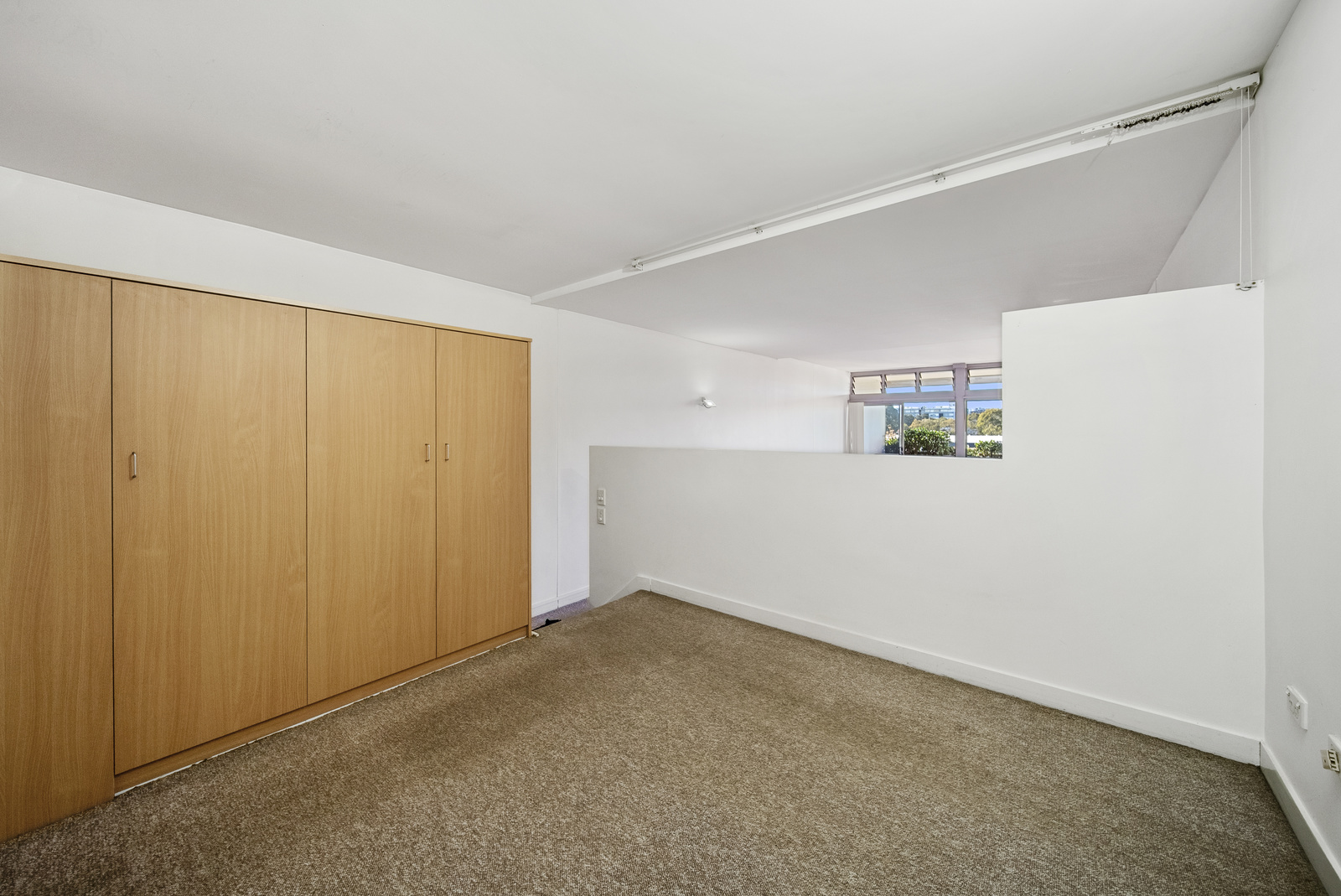 Loft style bedroom with built-in wardrobes